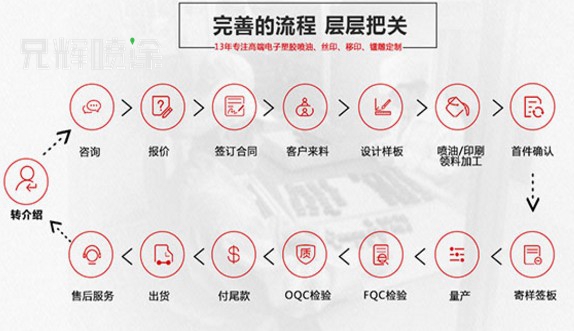 今天小编在此梳理下兄辉塑胶喷油加工具体签单流程和报价形式。其实喷油加工流程很简单,没那复杂。客户提供设计稿或样品,我司安排打样并寄出样品并报价,客户确认样品报价OK, 签定大货生产合同,我司安排生产大货,大货OK(拍照或寄大货样客户确认或客户亲自验货),确认没问题,我司安排发货。至于货款,客户根据合同上的条例来进行。当然,针对个别的客户要求也是不同的。